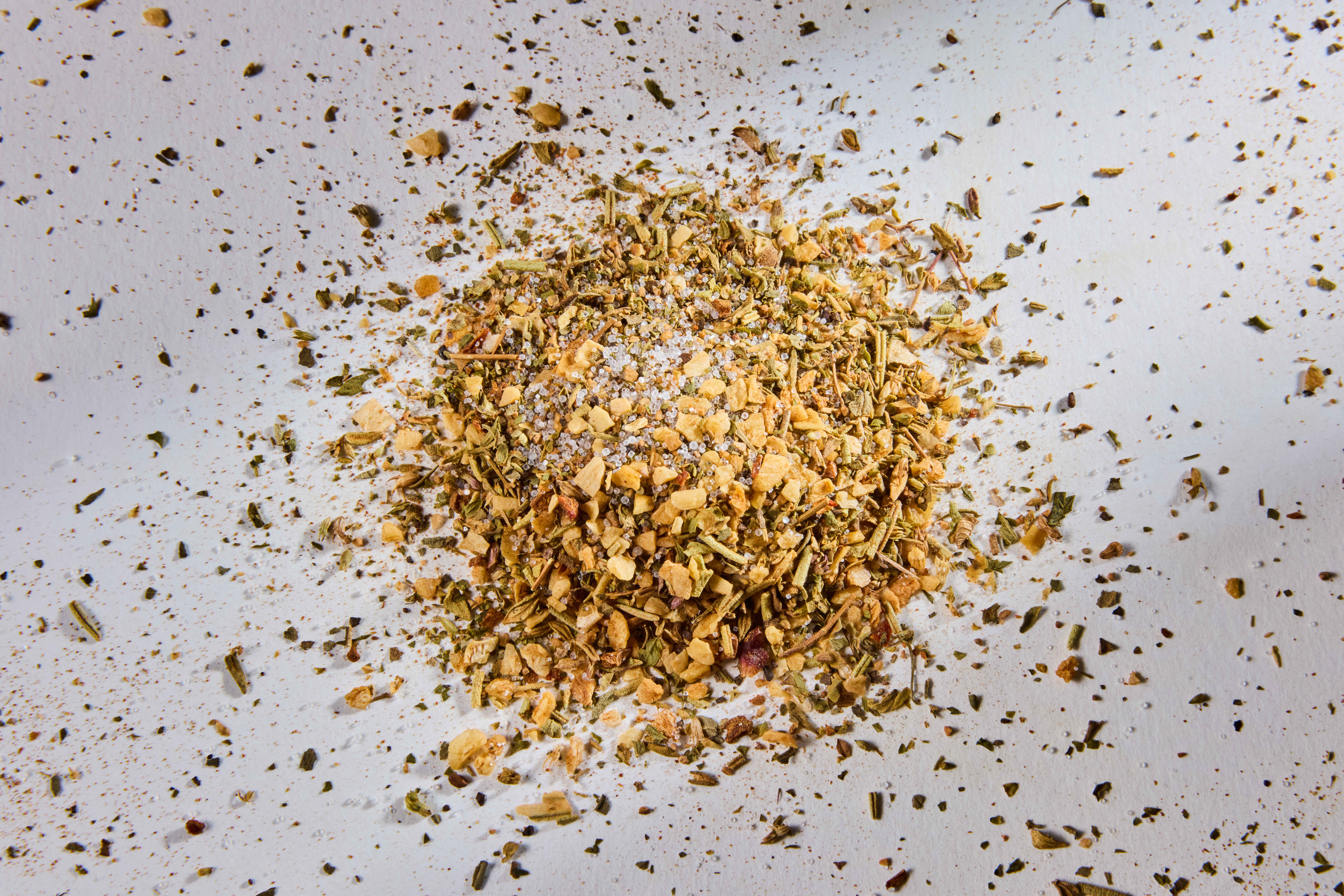 Knoblauchscheiben, Chilis, Tomatenflocken, Paprikaflocken, Meersalz grob, Karotten, Lauch, Beyfuß, Sellerie, Basilikum, Oregano, Petersilie, Telly-Cherry-Pfeffer, Thymian, Rosmarin, Salbei, Pilzpulver und Majoran