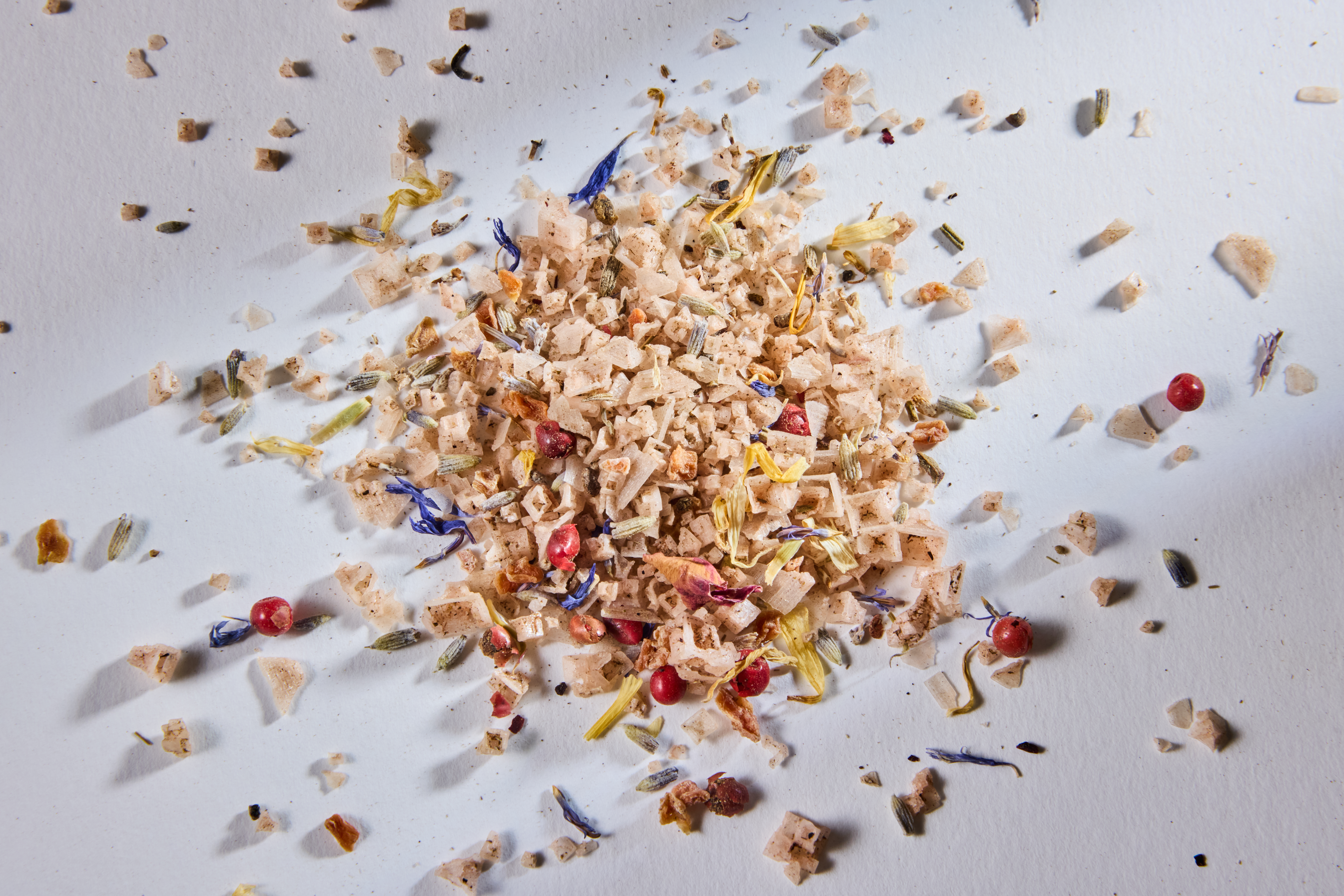 Rosa Salz Pyramiden, Pfeffer (grün, weiß und schwarz), Piment, Wacholder, rosa Beeren, Lavendelblüten, Karottengranulat, Hibiscus-Blüten-Flocken, Zitronengras, Blütenmix (Ringelblumen, Korn-blumen und Rosen)
